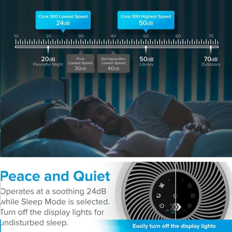 Díky patentované technologii QuietKEAPTM ani nebudete vědět, že je čistička Levoit Core 300S v provozu. Pro nerušený spánek byl navržen speciální noční režim s hlučností pouhých 24 dB. V nočním režimu se také aktivuje tlumené osvětlení nebo můžete světlo zcela vypnout. Speciálně tato nízká hlučnost je výhodou proti čističkám vzduchu jiných výrobců.