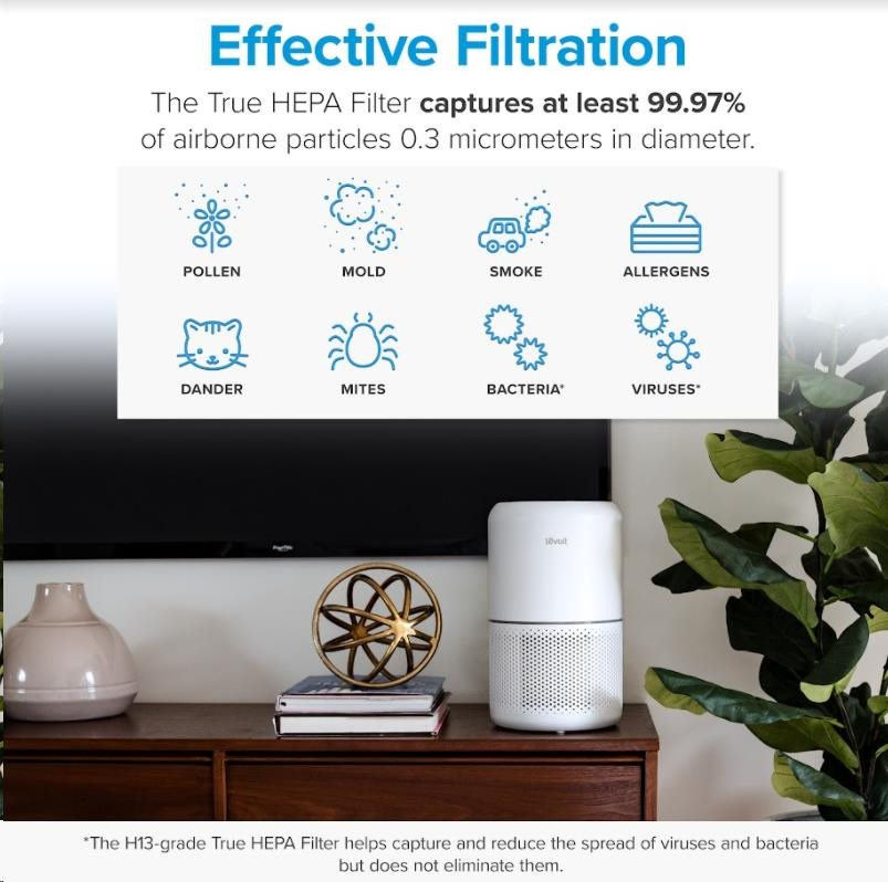 Druhou vrstvou je HEPA filtr H13. To odlišuje Levoit od konkurence, protože filtr HEPA H13 je mnohem kvalitnější a spolehlivější než běžně používané HEPA H11. Tu se odfiltrují jemné prachové částice, plíseň, bakterie, pyl, kouřové částice, roztoče a srst.