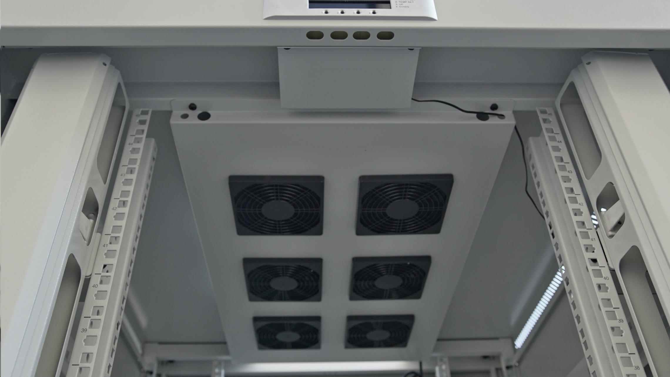 LEXI-Net 19" stojanový rozvaděč 45U 800x800 rozebiratelný, ventilace, termostat, kolečka, 600kg, sklo, rozložený, šedý