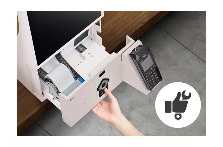 Důmyslný zásuvkový design kiosku LG umožňuje mimořádně pohodlnou údržbu a doplňování spotřebního materiálu. Integrovaná tiskárna účtenek i čtečka karet jsou umístěny ve spodní výsuvné části – stačí ji jednoduše otevřít, a to bez nutnosti jakékoliv složité demontáže těla kiosku.