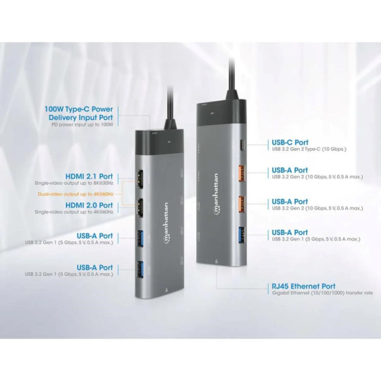 Zvyšte svou produktivitu s počítačem PC, Mac nebo tabletem pomocí této vysoce univerzální dokovací stanice od společnosti Manhattan. Pomůže vám vykonávat více úkolů na dvou UHD HDMI monitorech současně. Většinu potřeb v oblasti konektivity také uspokojíte díky pěti portům SuperSpeed USB-A, které rychle připojují a nabíjejí kompatibilní zařízení, a také portu SuperSpeed USB-C pro přenos dat pro připojení zařízení s vysokou propustností. Přiložený port Ethernet s automatickou detekcí 10/100/1000 vám pomůže připojit se ke kabelové síti a vstup pro napájení až 100 W Power Delivery (PD) pomůže napájet všechna zařízení USB, která se k doku připojí.