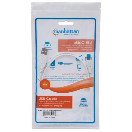Manhattan Hi-Speed USB 2.0 Device Cables easily connect USB peripherals and accessories with desktop and notebook computers. Ideal for use with many USB external enclosures, hubs and other hot-swap, plug-and-play devices, Manhattan Hi-Speed USB 2.0 Device Cables support data transfer rates up to 480 Mbps on Windows and Mac systems for fast, reliable transmissions. Nickel-plated contacts, shielding and fully molded boots with strain relief help provide dependable connections, maximum conductivity and minimal data loss with reduced EMI interference.