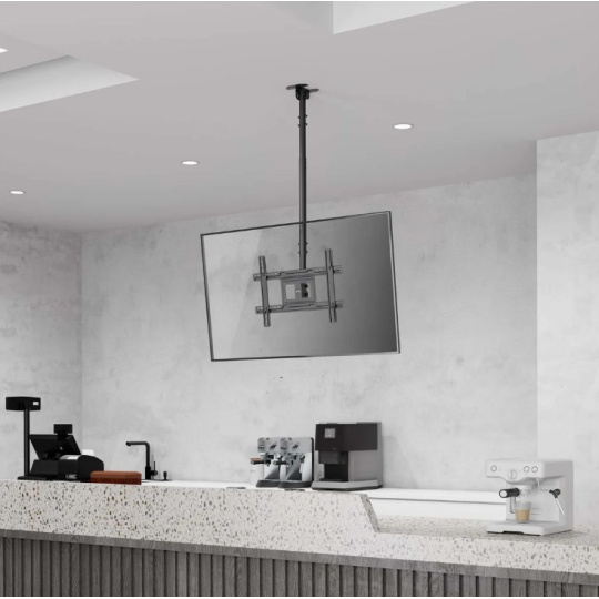 Vylepšete úhel pohledu, když je místo na stěně a podlaze omezené nebo není možné instalovat televizor nízko nad podlahou. Tento stropní držák na televizor Manhattan pojme LCD, LED nebo plazmový displej o úhlopříčce 37" až 80" a hmotnosti až 50 kg. Jeho práškově lakovaná, odolná ocelová konstrukce zajišťuje bezpečnou a spolehlivou instalaci nad hlavou.