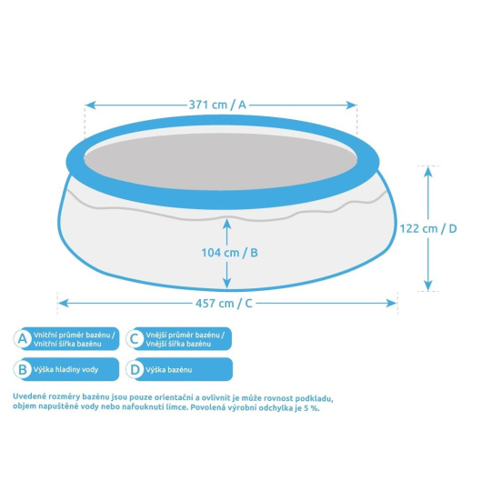 Uvedené rozměry bazénu jsou pouze orientační a ovlivnit je může rovnost podkladu, objem napuštěné vody nebo nafouknutí límce. Povolená výrobní odchylka je 5 %.