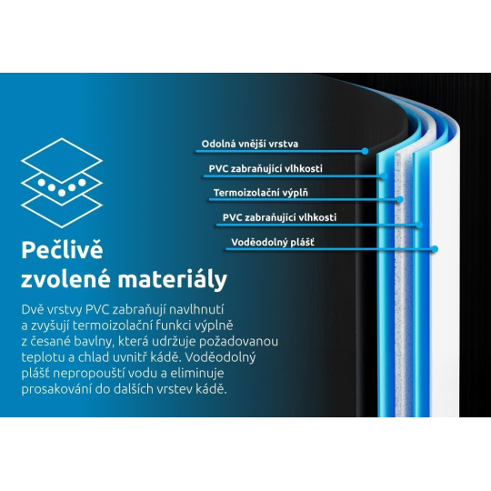 Termoizolační vrstva v podobě česané bavlny udržuje požadovanou teplotu a chlad uvnitř kádě. - PVC zabraňující vlhkosti