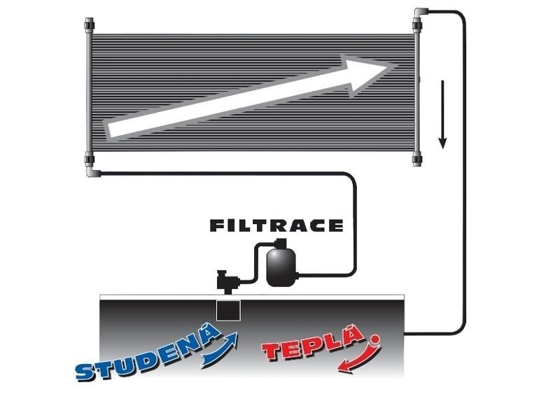 Solární panel Slim 180 pohlcuje tepelnou energii slunečních paprsků a předává ji vodě, která panelem proudí. Chladná voda z bazénu je pomocí bazénové filtrace vháněna do solárního panelu, kde se ohřívá a vrací se zpět do bazénu. Solární panel Slim napojíte na hadice o průměru 32 i 38 mm.