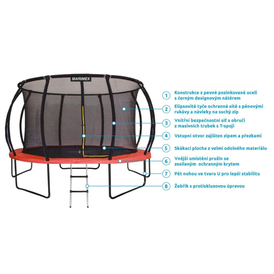 Trampolíny Marimex Premium nevynikají pouze novým designem a barevností, ale také větší stabilitou, pevností a bezpečností. Bezpečnost zajišťují zesílené ochranné kryty pružin a nová technologie T-spojů. Vnitřní ochrannou síť podpírá osm dynamicky prohnutých tyčí a napnutou ji drží zpevněná horní obruč. Skákací plocha je vyrobena z velmi odolného a neabrazivního materiálu s vysokou životností.