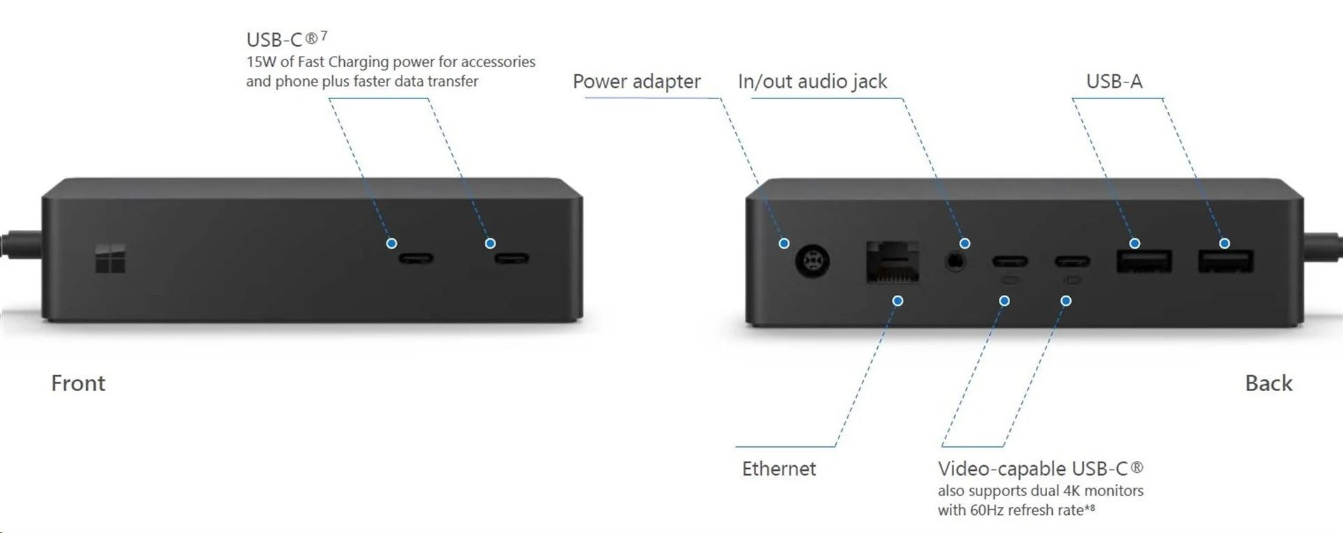 Originální a inovativní dokovací stanice Microsoft Surface Dock 2 je speciálně určena pro operační systém Windows 10 a zařízení Microsoft Surface. Disponuje rozhraním 2 x USB 3.2 Gen 2 (zadní, 7.5 W), 2 přední USB 3.2 Gen 2 (15W), 2 zadní USB 3.2 Gen 2 (DP1.4a) (7.5W), 3.5 mm audio in/out, gigabitový ethernet a zámkem Kensington. Podporuje až 2x 4K rozlišení, bleskurychlé dobíjení smartphonu přes USB-C a umožňuje administrátorské zásahy.
