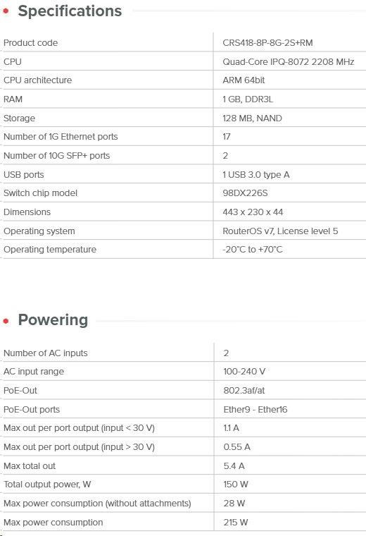 PoE CRS switch s 16x Gbps LAN (8 z nich s POE-out) , 2x 10Gbps SFP+, 1x USB 3.0 a dvěma RJ45 porty (management a konzole) v rack provedení. CRS418-8P-8G-2S+RM je dostatečně výkonný na to, aby nahradil většinu routerů pro malé a střední kanceláře. Vhodný především pro hybridní sítě na 2/3 vrstvě - ať už segmentujete síť pomocí VLAN, nebo mezi nimi routujete. Díky čtyřjádrovému procesoru ARM s frekvencí 2,2 GHz, HW offloading L3 a systému RouterOS v7 jej můžete používat jako internetovou bránu, firewall, a dokonce i jako řadič CAPsMAN. Využít můžete 8 PoE-out portů (802.3af/at a 24V pasivní PoE-out) pro napájení zařízení přímo ze switche s až 150 W celkového výkonu, inteligentním řízením PoE a omezením proudu na port. Praktické řešení pro instalace vyžadující nepřetržitý provoz s enormními objemy dat Technické specifikace: Product code: CRS418-8P-8G-2S+RM CPU: Quad-Core IPQ-8072 2208 MHz Size of RAM: 1 GB, DDR3L Storage: 128 MB, NAND Number of 1 GbE Ethernet ports: 17 10G SFP+ ports: 2 USB ports: 1 USB 3.0 type A Operating system: RouterOS v7 (License level 5) Supported input voltage: 2x AC power supply 100 - 240 V Dimensions: 443 x 230 x 44 mm Operating temperature: -20°C to +70°C Napájecí specifikace: PoE-out: 802.3af/at PoE-out ports: Ether9 - Ether16 Max out per port output (input < 30 V) : 1.1 A Max out per port output (input > 30 V): 0.55 A Max total out : 5.4 A Total output power, W: 150 W Max power consumption: 215 W Max power consumption without attachments: 28 W Upozornění: Výrobce MIKROTIK nevztahuje záruku na zařízení poškozená přepětím. Zařízení je třeba na vstupech adekvátně chránit proti indukovanému elektrostatickému přepětí či přepěťovým špičkám na silovém vedení. Při venkovních instalacích je třeba používat stíněnou kabeláž (FTP/SFTP), příslušné přepěťové ochrany (pokud nejsou integrovány) a provést korektní a efektivní uzemnění. Zařízení vždy provozujte s poslední výrobcem publikovanou verzí (výrobcem označenou "Stable") operačního systému RouterOS. Taková verze garantuje nejoptimálnější funčknost, obsahuje opravené chyby z verzí předchozích a výkonová vylepšení.