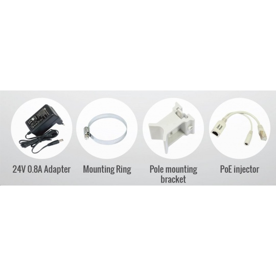 Balení obsahuje: SXT SA ac, PoE injektor, napájecí zdroj, montážní sada na stožár