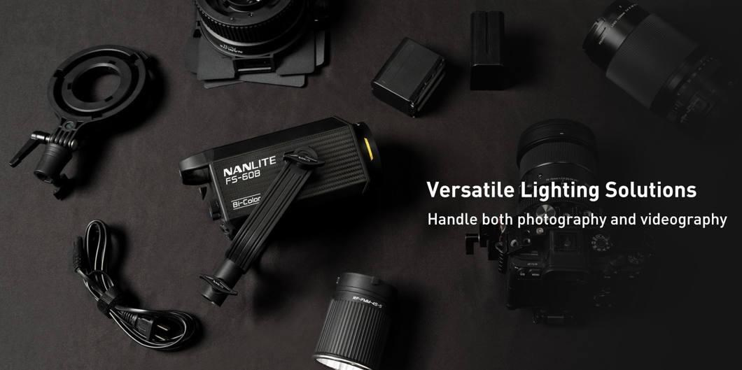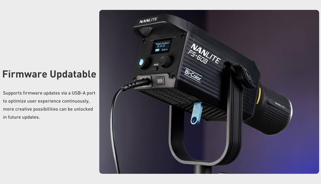 Model FS-60B má 12 vestavěných přizpůsobitelných efektů a dodává se spolu s adaptérovým bajonetem Bowens pro samostatně dostupné modifikátory světla.