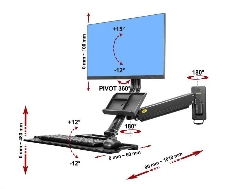 Kompletní specifikace Polohovatelná nástěnná pracovní stanice NB MB32 Profesionální držák na monitor 19" - 27" a klávesnici s myší, odkládací přihrádka, otáčení, náklon, výškové a délkové nastavení, VESA 75x75 a 100x100, nosnost 9kg, nejvyšší kvalita, systém vedení kabeláže, výškové polohování 480mm Profesionální držák na monitor a klávesnici, uchycení na svislou plochu (stěna, pilíř, sloup, stroje a zařízení). Polohování 3D - otáčení do stran, náklon monitoru, odsouvání a přisouvání ode zdi, výškové polohování (bez použití nářadí - dotykové), rotace monitoru (otočení na šířku nebo na výšku). Držák je vhodný pro zavěšení všech typů monitorů a All in One PC s úhlopříčkou 19" až 27" a hmotností 2-9kg. Police na klávesnici a myš s rozměry 560x200mm (možnost zaklopení) a přihrádka na dokumenty, vizitky, mobil a poznámky. Nejvyšší kvalita zpracování, snadná instalace a nastavitelnost. Systém skrytého vedení kabeláže. Barevné provedení černé. Držák na monitor nebo All in One Pc včetně poličky na klávesnici a myš, 3D polohování, profesionální, do kanceláře, výrobní haly, na stoje CNC a obráběcí, uchycení na svislou plochu nebo zeď - NB MB32 Technické údaje: nastavitelná nosnost dle hmotnosti monitoru 2kg až 9kg na monitory a All in One PC s úhlopříčkou 19" až 27" podpora VESA standardu 75x75 a 100x100 police na klávesnici a myš s rozměry 560mm x 200mm (možnost zaklopení, délková regulace 60mm) přihrádka na dokumenty, vizitky, poznánky, bločky, mobilní telefon otáčení do stran +/- 90° náklon obrazovky +12° / -12° výškové nastavení samotné obrazovky 100mm výškové polohování celého držáku 480mm rotace obrazovky PIVOT - natočení do vodorovné nebo svislé polohy vzdálenost od zdi 90mm až 1010mm plynová pružina pro výškové polohování bez použití nářadí (dotykové) systém pro vedení kabeláže materiál hliník, kryty plastové nejvyšší kvalita barevné provedení černé záruka 3 roky Držák All in One Pc nebo monitoru s poličkou na klávesnici a myš, uchycení na stěnu nebo svislou plochu, ideální do výroby, na stroje, CNC, obráběcí, do malých místností atd. - NB MB32 Držák na monitor NB MB32 podporuje VESA standardy: VESA 75x75 VESA 100x100 3D polohovatelný držák na monitor All in One Pc a klávesnici, uchycení na zeď nebo svislou plochu NB MB32 Nastavení výšky bez použití nářadí, snadno a rychle: Držák má integrovaný plynový píst, který po zavěšení monitoru otáčením imbusového klíče nastavíte na jeho hmotnost. Poté již bude držák zůstávat vždy v takové výšce, do které ho zatlačením na monitor nebo vytlačením dáte. Regulace výšky je možná v rozmezí 480mm. Ergonomická kancelář, držák monitoru a klávesnice s myší NB MB32 Kde lze držák monitoru nebo All in One PC s poličkou na klávesnici a myš použít: firmy, společnosti v kancelářích malé místnosti, práce bez stolu (možnost rychlého nastavení pro práci v sedě nebo vestoje) v dílnách v továrnách pozice na strojích (CNC, obráběcí atd.) ve skladech v domácnostech.
