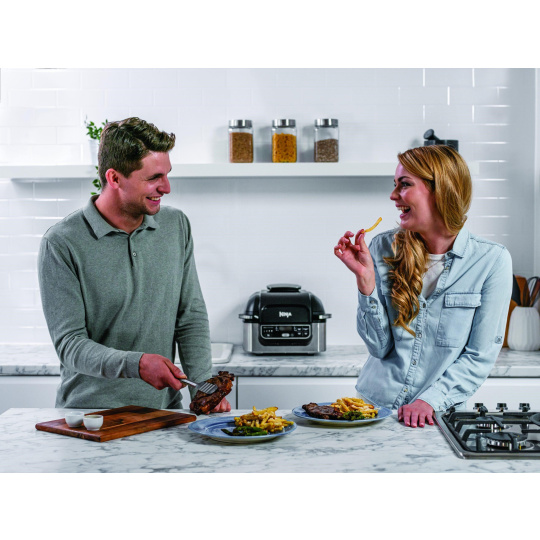 S tímto krytým grilem a fritézou Ninja Foodi je nyní příprava vašich oblíbených jídel snazší a rychlejší: připravujte čerstvé i mražené suroviny s autentickou grilovací úpravou. Díky teplotě grilování 265 oC můžete vařit s malým množstvím oleje nebo bez něj a dosáhnout rovnoměrného propečení a autentické grilovací chuti, aniž byste potřebovali zahradu..... více