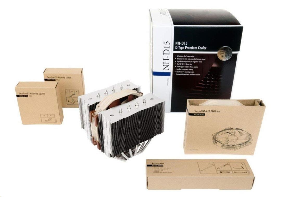 Built on the basis of the legendary NH-D14 and carrying on its quest for ultimate quiet cooling performance, Noctua’s flagship model NH-D15 is an elite-class dual tower cooler for the highest demands. Its expanded heatpipe layout and two premium grade NF-A15 140mm fans with PWM support for automatic speed control allow it to further improve the NH-D14’s award-winning efficiency. Topped off with the trusted, pro-grade SecuFirm2™ multi-socket mounting system, Noctua’s proven NT-H1 thermal compound and full 6 years manufacturer’s warranty, the NH-D15 forms a complete premium quality solution that represents a deluxe choice for overclockers and silent-enthusiasts alike.