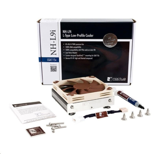 The NH-L9i is a premium quality quiet CPU cooler for Intel LGA115x based HTPCs and Small Form Factor systems. At a super-low profile of only 37mm, the NH-L9i is ideal for extremely slim cases and due to its 95x95mm footprint, it provides full compatibility with tall RAM modules and VGA cards on mini-ITX mainboards. The custom designed SecuFirm2™ mounting system for LGA115x makes installation a child’s play and thanks to the highly optimised NF-A9x14 premium fan that supports fully automatic speed control via PWM, the NH-L9i runs remarkably quiet. Topped off with Noctua’s renowned NT-H1 thermal compound, the NH-L9i fuses everything users have come to expect from Noctua’s larger coolers into a super-compact package for slim HTPC systems.