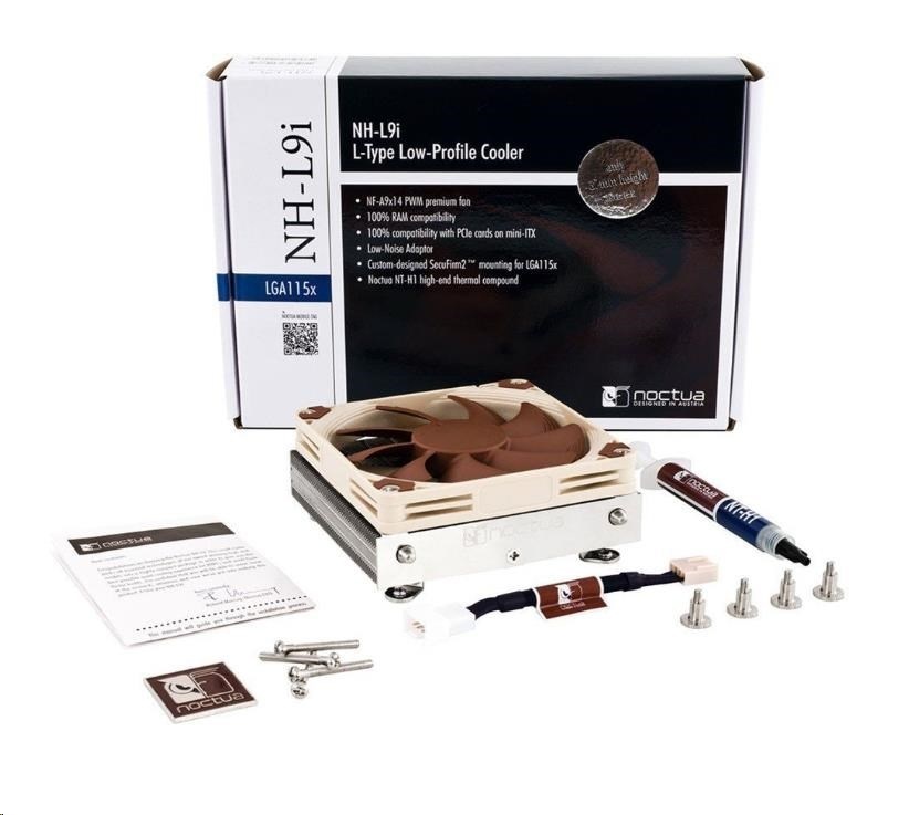 The NH-L9i is a premium quality quiet CPU cooler for Intel LGA115x based HTPCs and Small Form Factor systems. At a super-low profile of only 37mm, the NH-L9i is ideal for extremely slim cases and due to its 95x95mm footprint, it provides full compatibility with tall RAM modules and VGA cards on mini-ITX mainboards. The custom designed SecuFirm2™ mounting system for LGA115x makes installation a child’s play and thanks to the highly optimised NF-A9x14 premium fan that supports fully automatic speed control via PWM, the NH-L9i runs remarkably quiet. Topped off with Noctua’s renowned NT-H1 thermal compound, the NH-L9i fuses everything users have come to expect from Noctua’s larger coolers into a super-compact package for slim HTPC systems.