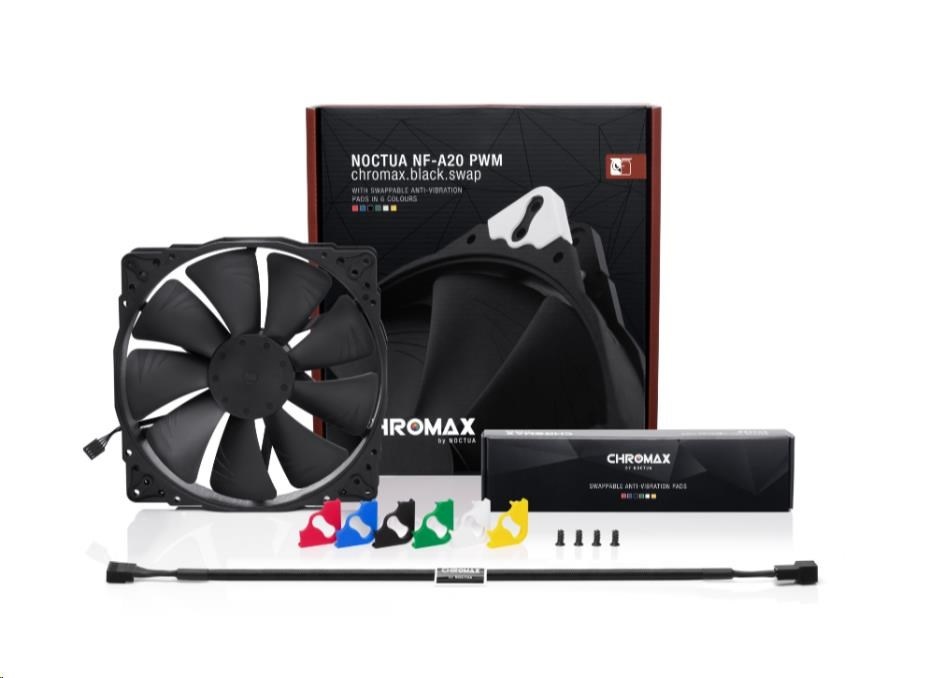 Řada NF-A20 se zasloužila o přední volbu při výběru 200mm větráčků množstvím ocenění a doporučení od technických časopisů a stránek po celém světě. NF-A20 PWM chromax.black.swap kombinuje tichý chod této řady a elegantní celočerný design řady chromax.black. Balení obsahuje také sady různobarevných kabelů a protivibračních podložek pro ty, kteří si rádi svůj stroj barevně sladí. Kvalitu chodu a spokojenost také zaručí SSO2 ložisko, více než 150000 hodin MTTF a 6 let záruky u výrobce.
