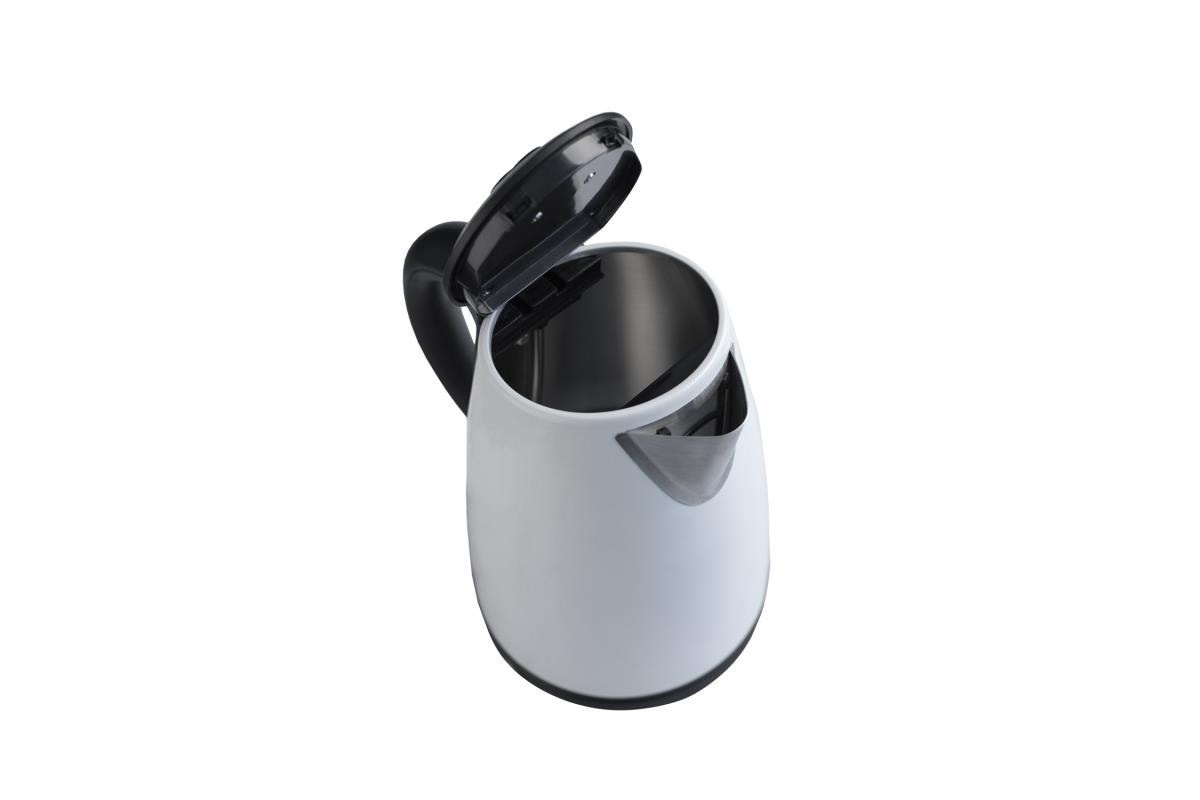 Elektrická varná konvice - bílá. Varná nádoba z ušlechtilé nerezové oceli. Objem 1,7l. Otevírání vrchního víka konvice stisknutím tlačítka. Varná nádoba na odnímatelném 360° otočném podstavci. Topné těleso překryté plotnou s ušlechtilé oceli. Stupnice hladiny vody. Ochrana před ohřevem bez vody. Auto vypnutí. Vyjímatelné filtrační sítko na vodu. Síťová šňůra odkladatelná v podstavci. Napájení 230V 50 Hz, 2000 W.