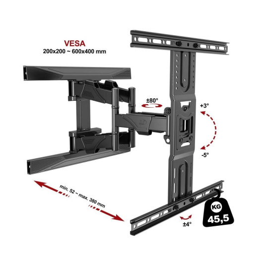 Kvalitní držák na Tv NB DF600-P6 Kvalitní polohovatelný držák na Tv 43" až 75", výsuvný 52-380mm, otáčení do stran +/-60°, naklápění +3°/-5°, VESA 200x200 až 600x400, nosnost 45,5kg Otáčecí držák televize, snadná instalace na stěnu, velmi kvalitní spolehlivá konstrukce. Držák Tv NB DF600-P6 je ideální na televize s hmotností do 45kg a VESA standardy od 200x200 do 600x400, velikost Tv by měla být ideálně v rozmezí 43" až 75". Možnost vysouvání Tv od zdi do vzdálenosti až 38cm a mírného naklápění Tv +3° až -5° a otáčení do stran až +/- 60°. V případě nerovností na zdi je možné rovinu televize upravit +/- 4°. Barevné provedení černé, balení včetně instalačního materiálu, záruka 5 let. Vynikající nástěnný držák pro otáčení televize NB DF600-P6 Technické údaje: nosnost držáku 45,5kg ideální na Tv s úhlopříčkou 43" až 75" podpora VESA standardů 200x200 až 600x400 nastavení vzdálenosti od zdi 52 až 380mm otáčení Tv do stran až +/- 60° možnost naklápění Tv +3° až -5° regulace roviny obrazovky +/- 4° úchytky na kabeláž dizajnové krytky nástěnného úchytu špičková, velmi pevná a spolehlivá konstrukce materiál ocel záruka 5 let Široká škála polohování televize na držáku Tv NB DF600-P6 Držák DF600-P6 podporuje VESA standardy: VESA 100x200 VESA 200x200 VESA 300x200 a 200x300 VESA 300x300 VESA 400x200 a 200x400 VESA 400x300 a 300x400 VESA 400x400 VESA 600x400 Výborný držák se spolehlivou konstrukcí bez vůlí a bezúdržbovým provedením čepů v kloubech držáku. Držák DF600-P6 je vhodný na veškeré televize s hmotností do 45,5kg, které podporují kterýkoli z výše uvedených VESA standardů..