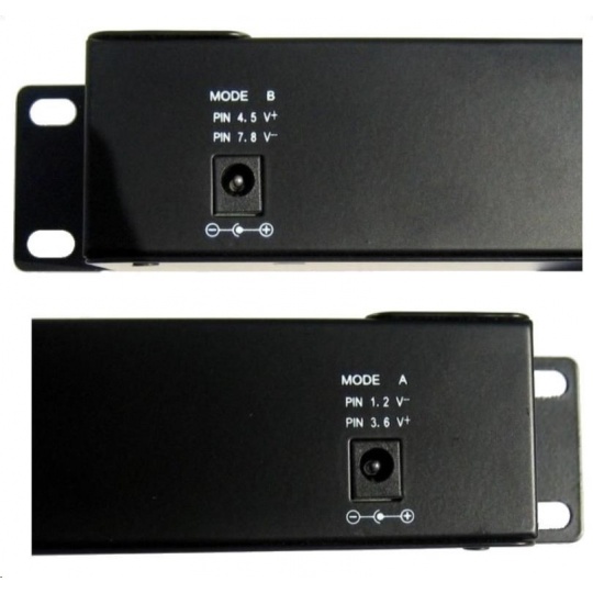 Vstup pro napájení prostřednictvím dvou 2.1mm 60V jacků, z obou vstupů je vždy zároveň napájeno všech 12 portů v režimu dle zvoleného A/B vstupu: