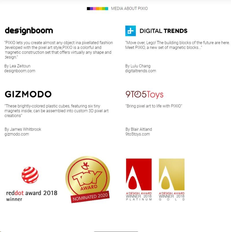 PIXIO získalo několik prestižních ocenění jakými jsou Red Dot Award, TOY AWARD, A´DESIGN AWARD Gold a A´DESIGN AWARD Platinum.