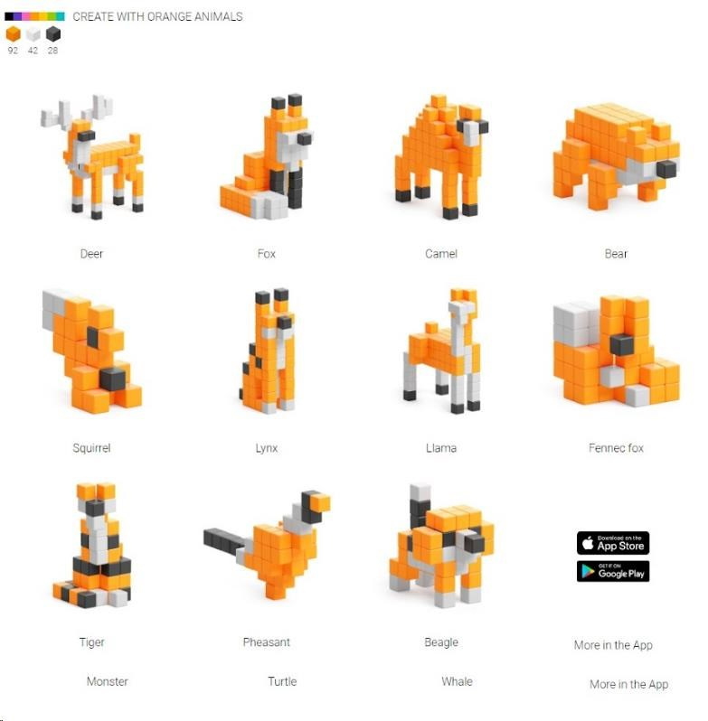 DESIGNOVÁ ŘADA PIXIO Orange Animals obsahuje 162 bloků PIXIO ve 3 barvách. Umožní oživit vaše