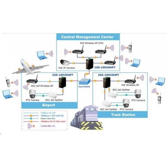 Planet IGS-10020HPT PoE switch 8x 1000Base-T, 2x SFP, 802.3at 270W, IP30, -40 až 75°C, SNMP, IGMPv3, IPv6 Inteligentní přepínače pro průmyslový Ethernet jsou určeny do náročných provozních podmínek s velkým rozsahem pracovních teplot, nejistým napájením a častými otřesy. Zároveň poskytují vynikající možnosti vícenásobných propojení pro dosažení robustnosti propojení systémů s velmi nízkou dobou zotavení. IGS-10020HPT je vybaven pro redundanci kromě dobře známé metody Spanning Tree (jejíž doba zotavení je v řádu sekund) především specializovanou funkcí "Redundant ring" která má dobu zotavení a nalezení nové cesty do 300ms. Jako PoE přepínač umožňuje přímo napájet až 8 koncových zařízení dle normy IEEE 802.3at, je tak ideálním prvkem pro aplikace se sníženou možností napajení. Přepínače řady IGS se snadno instalují na standardní DIN lištu nebo přímo na zeď a umožňují nasazení dobře známé Ethernetové technologie i v průmyslovém prostředí. Stejně tak jsou vhodné pro instalace do venkovně umístěných skříní s velkým kolísáním pracovních teplot (typicky bezdrátové a MAN ISP aplikace). Vlastnosti: - 8 portů 1000Base-T, Switching, Full Duplex (1000/2000 Mbps), Auto-Negotiation (10/100/1000 Mbps), automatická detekce přímý/křížený kabel na každém portu - na všechny implementace PoE IEEE 802.3at injektory se zatížitelností 30W/port, celkově až 270W - 2 porty SFP pro instalaci modulů 1000Base-SX/LX/BX nebo 100Base-FX - propustnost: sběrnice 20Gbps, 14,8Mp/s (64B) - podpora Jumbo Frame do 9kB, 8k MAC adres, buffer 4Mbity - 255 VLAN IEEE 802.1Q sítí, MAC nebo protocol based VLAN, VoIP VLAN - agregace linek "port trunking" IEEE 802.3ad LACP - IGMP v1,v2,v3 až do 256 multicast skupin, IGMP querier mode - 8-úrovní QoS prioritizace provozu dle portu, DSCP/ToS, 802.1p nebo 802.1Q značky - podpora Spanning Tree IEEE 802.1d, Rapid Spanning Tree IEEE 802.1w - IP/MAC ACL (access control list) do 123 pravidel, MAC/IP binding - DHCP snooping - port shaper - administrace Web/SNMPv3 s podporou zabezpečeného přenosu SSH/SSL - podpora IPv4/IPv6 - PoE scheduler pro možnost zapínání/vypínaní napájení podle časového plánu - pole LED indikátorů pro diagnostiku provozu - instalace na DIN lištu, montážní díl součástí - instalace na zeď, montážní díl součástí - krytí IP30 - napájení: 48V DC redundantní, připojení možné ze dvou různých zdrojů (nejsou součástí balení); vlastní příkon do 30W - ochrana proti přepólování, připojení napájení na svorkovnici, umístění na spodním panelu (nepřekáží při montáži na zeď) - přepěťová ochrana napájení do 6kV proti napěťovým špičkám (EFT) - přepěťová ochrana LAN portů do 6kV proti elektrostatickému náboji (ESD) - spínací poplachové relé (24V/1A) při výpadku primárního napájení - zařízení je odolné proti pádu (IEC-60068-2-32) z výšky 75cm na všechny dopadové části - zařízení je odolné proti vibracím (IEC-60068-2-6) 10-500-10Hz, 4x g, 0,5oct/min - zařízení je odolné proti přetížení krátkodobému zrychlení 50g, dlouhodobému 4g, (IEC-60068-2-27) - EMI/EMS, elektromagnetická kompatibilita a slučitelnost dle CE EN-6100-4-2,3,4,5,6 - elektrická bezpečnost dle CE EN-60950 - pracovní teplota -40 až 75°C, vlhkost do 95% - hmotnost: 1684g - rozměry: 152 x 107x 72 mm.