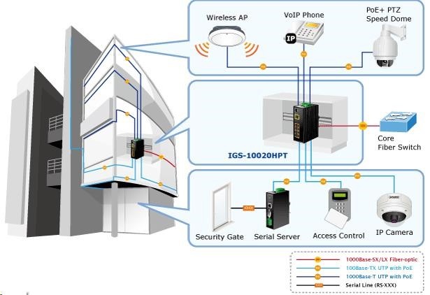 Planet IGS-10020HPT PoE switch 8x 1000Base-T, 2x SFP, 802.3at 270W, IP30, -40 až 75°C, SNMP, IGMPv3, IPv6 Inteligentní přepínače pro průmyslový Ethernet jsou určeny do náročných provozních podmínek s velkým rozsahem pracovních teplot, nejistým napájením a častými otřesy. Zároveň poskytují vynikající možnosti vícenásobných propojení pro dosažení robustnosti propojení systémů s velmi nízkou dobou zotavení. IGS-10020HPT je vybaven pro redundanci kromě dobře známé metody Spanning Tree (jejíž doba zotavení je v řádu sekund) především specializovanou funkcí "Redundant ring" která má dobu zotavení a nalezení nové cesty do 300ms. Jako PoE přepínač umožňuje přímo napájet až 8 koncových zařízení dle normy IEEE 802.3at, je tak ideálním prvkem pro aplikace se sníženou možností napajení. Přepínače řady IGS se snadno instalují na standardní DIN lištu nebo přímo na zeď a umožňují nasazení dobře známé Ethernetové technologie i v průmyslovém prostředí. Stejně tak jsou vhodné pro instalace do venkovně umístěných skříní s velkým kolísáním pracovních teplot (typicky bezdrátové a MAN ISP aplikace). Vlastnosti: - 8 portů 1000Base-T, Switching, Full Duplex (1000/2000 Mbps), Auto-Negotiation (10/100/1000 Mbps), automatická detekce přímý/křížený kabel na každém portu - na všechny implementace PoE IEEE 802.3at injektory se zatížitelností 30W/port, celkově až 270W - 2 porty SFP pro instalaci modulů 1000Base-SX/LX/BX nebo 100Base-FX - propustnost: sběrnice 20Gbps, 14,8Mp/s (64B) - podpora Jumbo Frame do 9kB, 8k MAC adres, buffer 4Mbity - 255 VLAN IEEE 802.1Q sítí, MAC nebo protocol based VLAN, VoIP VLAN - agregace linek "port trunking" IEEE 802.3ad LACP - IGMP v1,v2,v3 až do 256 multicast skupin, IGMP querier mode - 8-úrovní QoS prioritizace provozu dle portu, DSCP/ToS, 802.1p nebo 802.1Q značky - podpora Spanning Tree IEEE 802.1d, Rapid Spanning Tree IEEE 802.1w - IP/MAC ACL (access control list) do 123 pravidel, MAC/IP binding - DHCP snooping - port shaper - administrace Web/SNMPv3 s podporou zabezpečeného přenosu SSH/SSL - podpora IPv4/IPv6 - PoE scheduler pro možnost zapínání/vypínaní napájení podle časového plánu - pole LED indikátorů pro diagnostiku provozu - instalace na DIN lištu, montážní díl součástí - instalace na zeď, montážní díl součástí - krytí IP30 - napájení: 48V DC redundantní, připojení možné ze dvou různých zdrojů (nejsou součástí balení); vlastní příkon do 30W - ochrana proti přepólování, připojení napájení na svorkovnici, umístění na spodním panelu (nepřekáží při montáži na zeď) - přepěťová ochrana napájení do 6kV proti napěťovým špičkám (EFT) - přepěťová ochrana LAN portů do 6kV proti elektrostatickému náboji (ESD) - spínací poplachové relé (24V/1A) při výpadku primárního napájení - zařízení je odolné proti pádu (IEC-60068-2-32) z výšky 75cm na všechny dopadové části - zařízení je odolné proti vibracím (IEC-60068-2-6) 10-500-10Hz, 4x g, 0,5oct/min - zařízení je odolné proti přetížení krátkodobému zrychlení 50g, dlouhodobému 4g, (IEC-60068-2-27) - EMI/EMS, elektromagnetická kompatibilita a slučitelnost dle CE EN-6100-4-2,3,4,5,6 - elektrická bezpečnost dle CE EN-60950 - pracovní teplota -40 až 75°C, vlhkost do 95% - hmotnost: 1684g - rozměry: 152 x 107x 72 mm.
