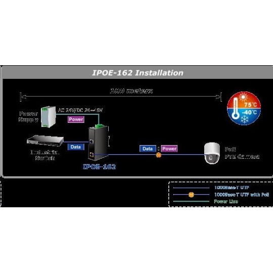 Planet IPOE-162 napájení po ethernetu IEEE802.3at, 30W, Gigabit, DIN, IP30, -40 až 75 C