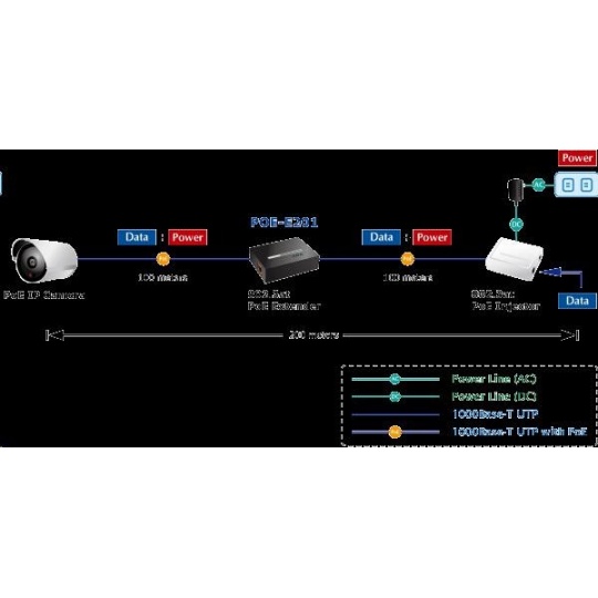 Řešení proudloužení segmentu ethernet včetně zvětšení dosahu napájení PoE (power over ethernet). Jedná se o jednoduché zařízení dovolující prodloužit maximální délku ethernet segmentu ze 100m na 200m nebo až 500m včetně zachování napájení IEEE 802.3at zařízení na konci vedení. Aplikace extenderu je ideální v místě použití IP kamer nebo bezdrátových přístupových bodů na jejich delší přípojné vzdálenosti. Cenově se tak jedná o levné rozšíření možnosti instalovat napájená zařízení do míst vzdálenějších od centrálního switche nebo racku. Použití spočívá v jednoduchém vložení extenderu na přerušené vedení. - rozhraní 10/100/1000 Base-T s IEEE 802.3at / 802.3af PoE, Auto MDI/MDI-X, Auto-Negotiation, RJ-45 - propustnost: až 1488000 paketů/s - maximální délka rámce: 1552 Bajtů - ochrana proti přepětí: do 2kV - rozměry: 94 x 70 x 26mm - hmotnost: 197g - napájení: PoE 802.3at na vstupu extenderu, vlastní příkon do 3,2W - FCC (Part 15, Class A), CE - provozní teplota: -10 až 60°.