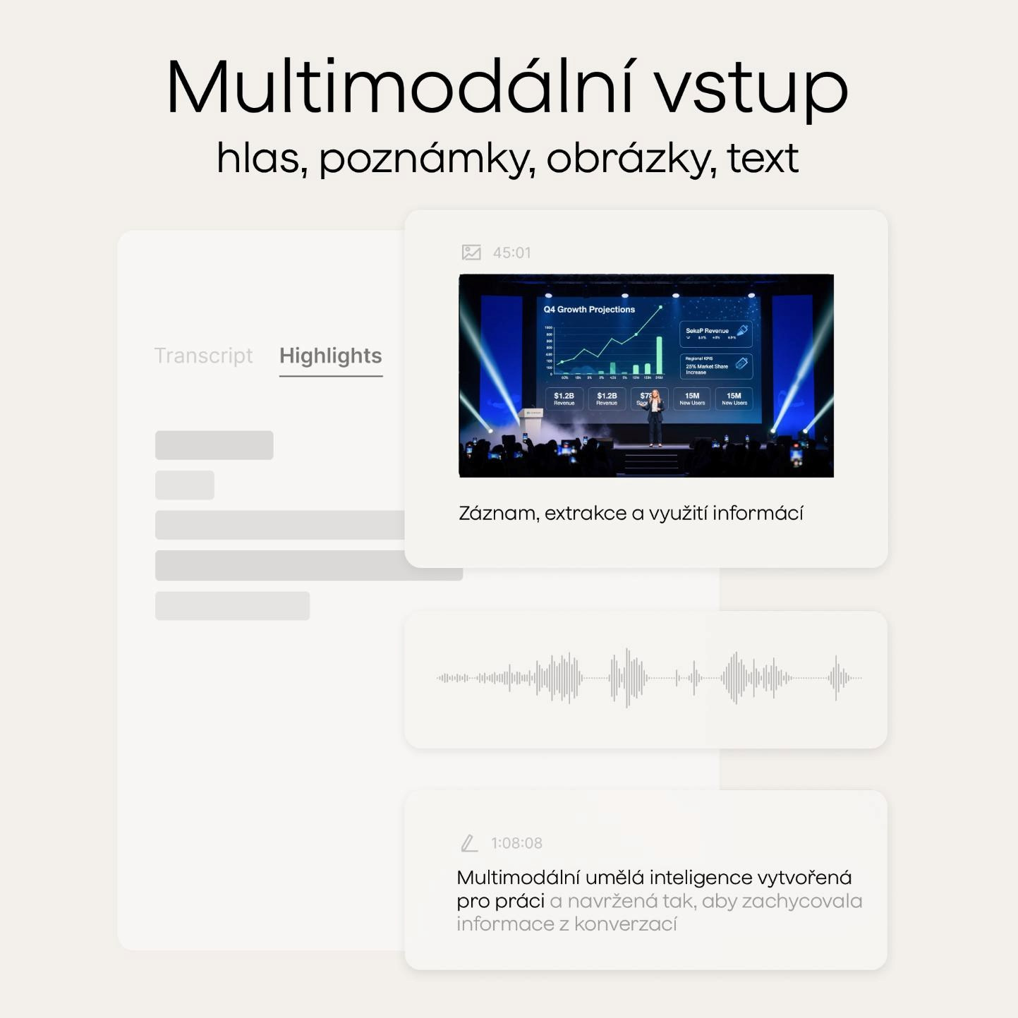 • Váš inteligentní AI asistent a partner: záznam, přepis, souhrn, organizace, dedukce