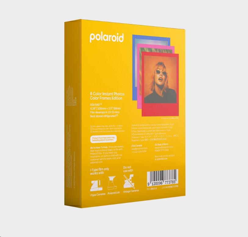 Osm instantních barevných fotografií s různě barevnými rámečky. K použití ve fotoaparátech řady i-Type. Snímky se začnou objevovat do 2 minut. Celé vyvolání trvá 10–15 minut. Film I-Type je optimalizován pro fotoaparáty Polaroid I-Type. Je levnější než náš standardní film, protože neobsahuje baterie. Film i-Type využívá naši nejnovější chemii barev k vytvoření fotografií s bohatými a pěkně vyváženými tóny a s přesně tak jemnou texturou, díky které jsou analogové fotografie tolik osobité. Jeho ikonický styl bílého rámečku představuje historii instantního fotografování.