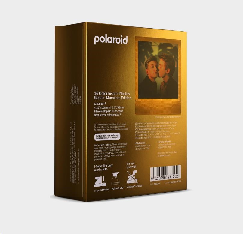 16 color instant photographs in a smooth gold finish for Polaroid i-type cameras. The photo starts to develop directly and the first signs of the photo is visual after a minute. The photo is fully developed in 10-15 minutes.