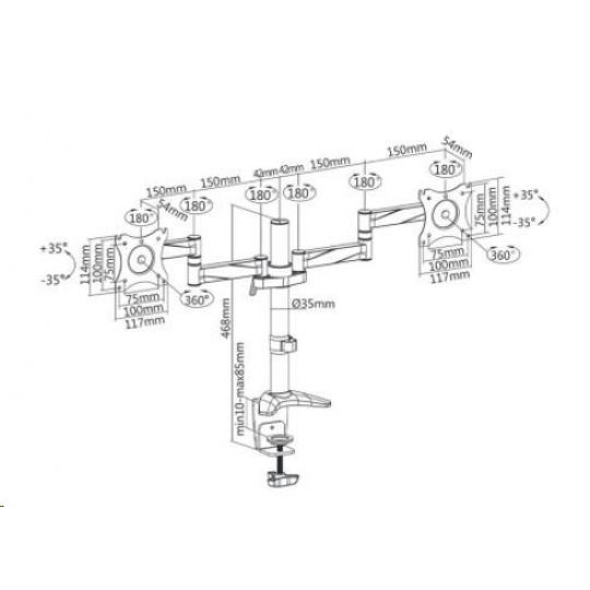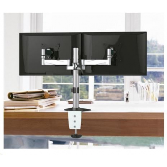 Kancelářský stolní držák na 2 monitory Fiber Mounts M71C4    Stolní držák na 2 monitory 13-27", otočný, sklopný, výškově polohovatelný, funkce pivot     Stolní držák pro zavěšení 2 monitorů o úhlopříčce 13 až 27". Plně nastavitelný - otáčení do stran, náklon, výškově polohovatelný, funkce pivot, korekce roviny obrazovky. Nosnost 16kg, VESA standard 75x75 a 100x100. Stolní držák na 2 monitory v krásném designu.     Fiber Mounts M71C4 je kvalitní a velmi pěkný stolní držák na 2 monitory, plně nastavitelnýStolní držák na 2 monitory do kanceláře pracovny nebo domácnosti Fiber Mount M71C4      Technické údaje:  nosnost 16kg (2x8kg) podporuje VESA standard 75x75 a 100x100 doporučujeme na monitory o velikosti 13 až 27" obě ramena jsou plně otočná do stran obě ramena umožňují nastavení vzdálenosti od nosníku funkce PIVOT - horizontální nebo vertikální otočení obrazovek korekce roviny obrazovek 2 typy uchycení na stolovou desku uchycení na stolovou desku o síle 10 až 85mm celková výška 400mm úchytky na kabeláž barva stříbrná, nosník chromový záruka 2 roky.