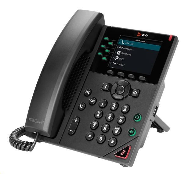 | Audio | Poly HD Voice; Technologie Poly Acoustic Clarity zajišťuje plně duplexní hovory a potlačuje akustickou ozvěnu i okolní šum; Technologie Poly Acoustic Fence potlačuje okolní hluk při použití sluchátka nebo kabelové náhlavní soupravy; Aplikace Poly Computer Audio Connector nainstalovaná v počítači (pouze Windows) umožňuje vybrat telefon pro zvukový vstup a výstup počítače a použít s počítačovými aplikacemi sluchátko, volitelnou náhlavní soupravu a handsfree hlasitý odposlech; Individuální nastavení hlasitosti s vizuální zpětnou vazbou pro každou zvukovou cestu; Detekce hlasové aktivity; Komfortní tvorba hluku; Generování tónů DTMF (RFC 2833 a v pásmu); Přenos zvukových paketů s nízkým zpožděním; Adaptivní paměti pro vyrovnání zpoždění |