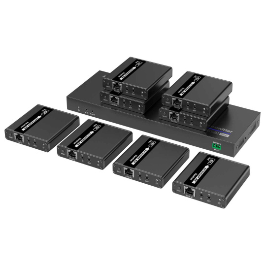 Extender se skládá z jedné vysílací jednotky s lokálním výstupem HDMI a dvou přijímačů, které se propojí CAT6/6a/7 kabelem s vysílačem.