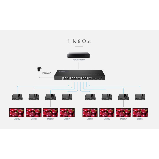 Splitter+extender umožňuje připojit dvě HDMI monitory na vzdálenost 70m a zobrazit UHD 4K@30Hz až na 70m