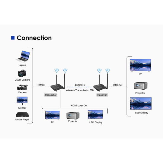 - Poporuje bezdrátový přenos rozlišení 4K@60Hz a Full HD 1080p na vzdálenost až 50m