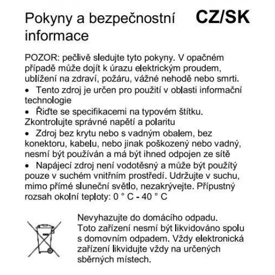 • 100-240V / 50Hz AC vstupní napětí, síťová vidlice