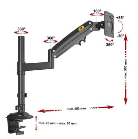 Stolní držák na monitor Fiber Mounts H100B Stolní držák na monitory 17-35", plně polohovatelný 3D Špičkový stolní držák s uchycením na okraj stolu nebo kamkoliv do prostoru. VESA standard 75x75 a 100x100 pro uchycení monitorů s úhlopříčkou 17-35". Držák umožňuje plnou nastavitelnost polohy monitoru: otáčení do stran, duální výškové polohování, naklápění, vzdálenost od uchycení a rotace monitoru. Rameno držáku je osazeno plynovým pístem s nastavitelnou tuhostí 2-12kg, výškové polohování je tedy extrémně jednoduché a pohodlné. Barevné provedení černé, záruka 3 roky. Držák na monitor uchycení na okraj stolu nebo do prostoru, otočný, sklopný, výškové polohování, výsuvný - Fiber Mounts H100B Technické údaje: zatížení: minimálně 2kg, maximálně 12kg na monitory s úhlopříčkou 17" až 35" VESA standardy 75x75 a 100x100 duální výškové polohování (ramenem s pístem 250mm + objímkou na nosníku 300mm) celkové nastavení výšky od stolu 0-550mm otáčení do stran +360° / -360° náklon +85° / -30° rotace obrazovky - na šířku nebo na výšku dva typy úchytů na stolovou desku (na okraj stolu nebo do prostoru stolové desky) uchycení na stolové desky o průměru 25-80mm systém pro uspořádání kabelů barevné provedení černé záruka 3 roky.