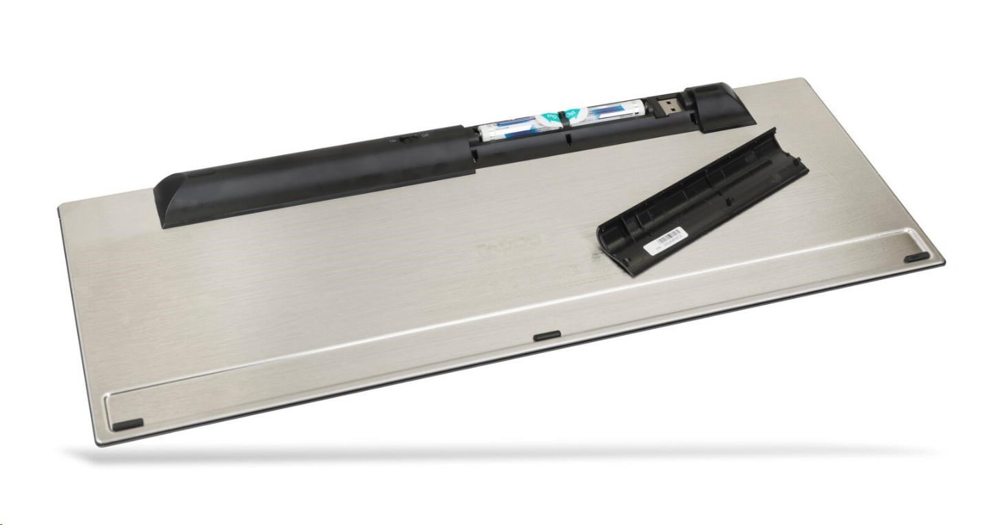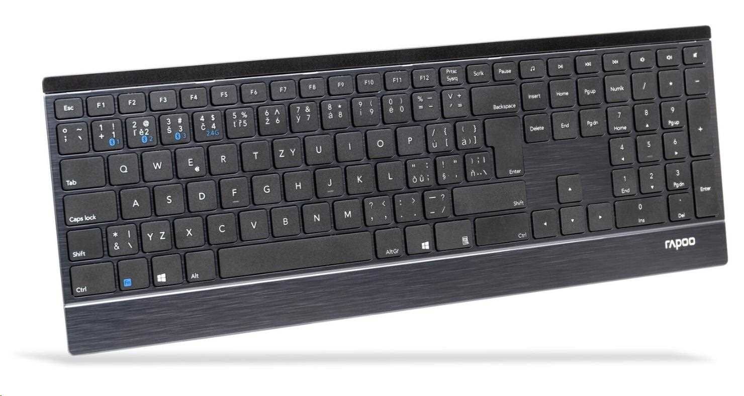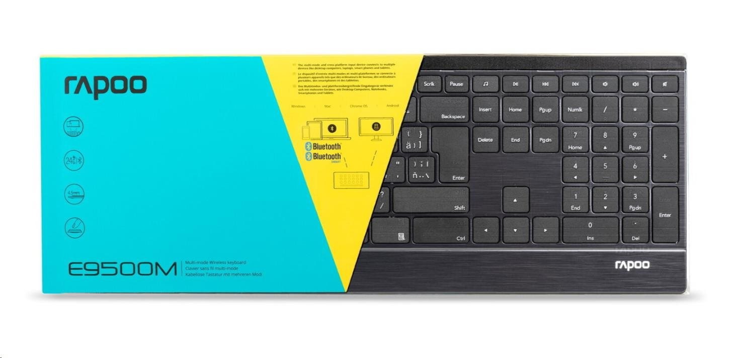 Tato ultratenká klávesnice spojuje prvotřídní materiály se stylovým designem. Tělo klávesnice vyrobené z nerezové oceli a hliníkové slitiny je nejen pevné a odolné, ale zároveň dodává pracovnímu stolu určitý styl. Klávesnice E9500M je nejen vyspělá konstrukcí, ale také funkcionalitou. Nabízí vícerežimovou technologii připojení firmy Rapoo – prostřednictvím spolehlivého bezdrátového vysílače 2,4 GHz, Bluetooth 3.0 a 4.1 – umožňuje současné připojení a přepnutí několika zařízení (s automatickým párováním). Navíc energeticky úsporná technologie firmy Rapoo zajišťuje životnost baterií až 12 měsíců, takže minimalizuje potřebu jejich výměny.