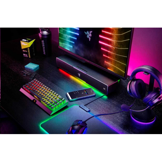 | OTHERS | Razer Chroma™ RGB (18 zones) THX Spatial Audio (PC based via Synapse 3) Bluetooth 5.2 (60ms low latency) USB audio input Razer Audio app Razer Chroma RGB app Custom 10-band EQ Raised feet on soundbar Headphone quick toggle Dimensions: Soundbar: 19.7 x 3.6 x 3.3" / 500 x 91.3 x 84 mm Subwoofer: 8.67 x 8.67 x 9.5" / 220 x 220 x 241.5 mm |