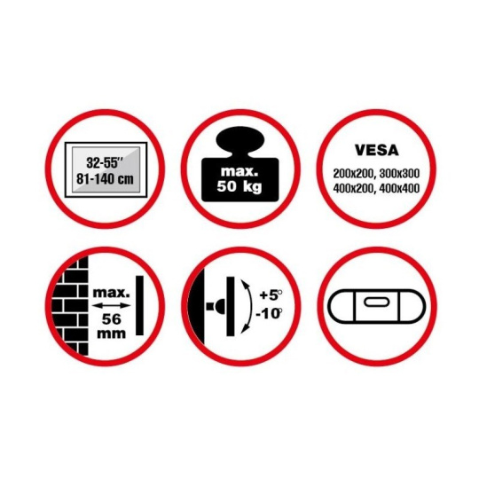 Nástěnný ocelový držák na Plasma a LCD TV s uhlopříčkou 32"- 55" (81-140cm) a hmotností maximálně 50kg. Konzole na zavěšení TV s vodováhou, vertikálně výklopný +5°/-10°, vzdálenost od stěny 56mm, materiál ocel, cenově výhodné, barva černá. Uchycení VESA: 200x200, 400x200, 300x300, 400x400..