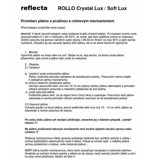 Roletové plátno ROLLO CrystalLine 160x130cm, viditelná plocha 156x88cm, 16:9, 71"/179cm, bílý hranatý kovový tubus 7x175cm/6kg, uchycení na stěnu nebo strop, materiál BetaLux - bílá 0,35 tkanina 300g/m2 s 2cm černým okrajem a zadní stranou, Gain=1,0, pozorovací úhel 120°. Lux - bílý matný povrch pro maximálně věrný a kontrastní obraz při alespoň částečném zatemnění. PVC materiál s textilním základem vytváří rovnou plochu bez zvlnění ale v krajích může docházet k prohnutí - postupně mizí. Snadné uchycení 4 vruty na plastových bocích plátna - stěna nebo strop. Možnost aretace polohy plátna při každé otáčce mechanizmu. Pozor při zpětném navíjení plátna je nutné plátno přidržovat - nesmí dojít k rychlému navinutí, které při nárazu na tubus může poškodit vnitřní mechanizmus bez možnosti uplatnění záruční doby..