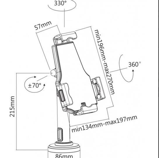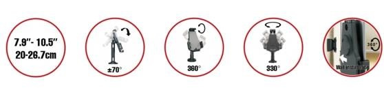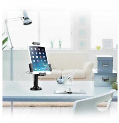 Bezpečnostní uchycení pro tablety 7,9-10,5" na stůl a na stěnu. Nastavitelný sklon tabletu rozmezí +70/-70° a navíc otočný 360°, fixace vruty ke stolu - 330° otočné kolem osy, hmoždinky do zdi, ocelové lanko proti odcizení, kabelový prostup, černý..