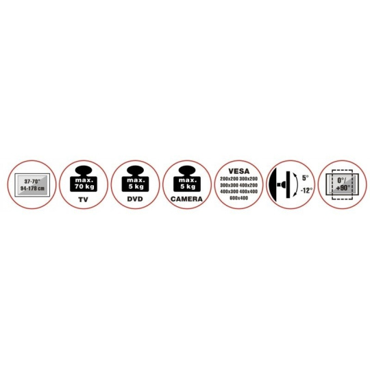 Televizní stolek na velké LCD TV s uhlopříčkou 37"- 70" (94-178cm) a hmotností maximálně 50kg. Středový nosný profil 125-160cm na kolečkách s aretací, držák výklopný +5°/-12°, horní výškově nastavitelná otočná plocha pro kameru max 5kg , polička 34x46cm max 5kg, Alu/ocel, barva bílá. Uchycení VESA: 200x200, 300x300, 400x200, 400x400, 600x400..