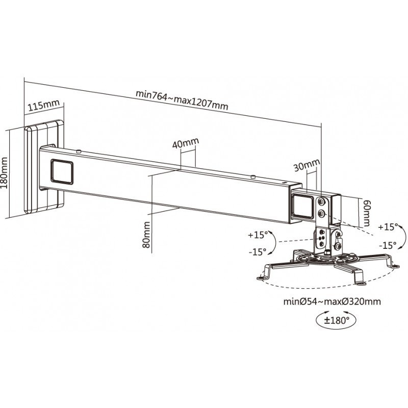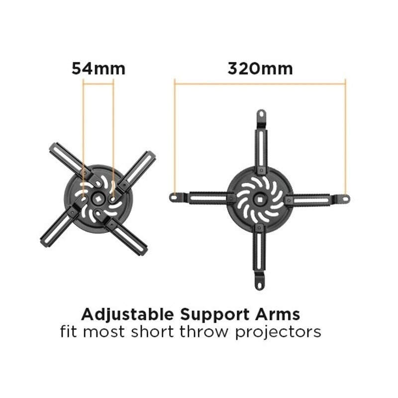 Nástěnný držák na dataprojektory - vzdálenost od stěny 76-120 cm, přístroj lze otočit o 360° a naklonit +/-15°, maximální zatížení 15kg, kabelový prostup, bílý. Univerzální systém uchycení dataprojektorů (rozsah 5,4-32 cm)..