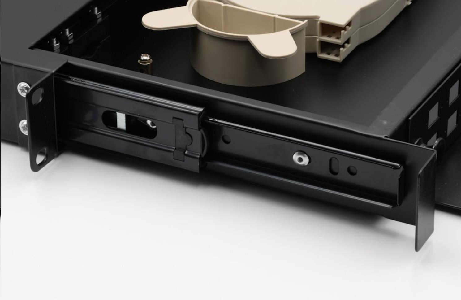 19" rozvaděč, výška 1U, pro 24 simplex adaptérů SC nebo duplexních LC, barva černá, kovová skříň, kazeta na svarky. Vana se vysouvá pomocí pojezdových kolejnic.