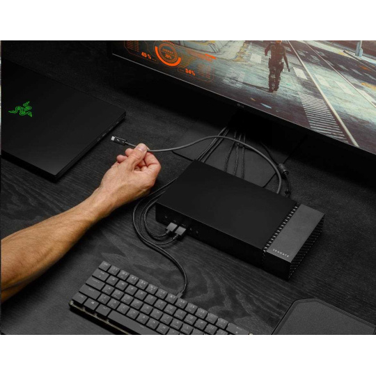 Hrajte tvrději s Seagate® FireCuda® Gaming Dock, elitním 4TB úložným hubem, který propojuje celou stolní bitevní stanici – klávesnici, myš, USB sluchátka, webovou kameru, monitor displeje a další – prostřednictvím jednoho kabelu Thunderbolt 3. Zapojte jej do notebooku a použijte rozšiřitelný slot M.2 NVMe pro práci s upgradem FireCuda 510 NVMe SSD pro přeplňované spouštění aplikací a doby načítání. Je dokonce vybaven přizpůsobitelnými RGB LED světly pro rovnoměrné osvětlení.