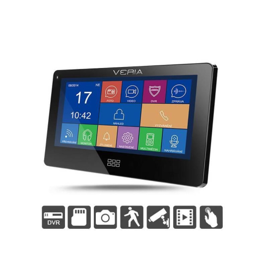 Unikátní ultra tenký videotelefon v elegantním designu se 7" plně dotykovým displejem, intuitivním ovládáním a vstupní / dveřní stanicí s kamerou VERIA 230 spojující hned několik velmi zajímavých funkcí do jednoho přístroje. VERIA 7077 nabízí svému uživateli komfortní kombinaci videotelefonu a jednoduchého DVR monitorovacího systému s možností zachycení snímku nebo video záznamu využívající například tak sofistikované funkce, jako je detekce pohybu nebo podpora připojení externích CCTV kamer pro sledování okolí. V případě, že chce uživatel z jakéhokoliv důvodu pořídit záznam z těchto externí kamer, postačí stisknout klávesu pro zachycení snímku nebo klávesu video nahrávání zobrazené v pravé části displeje a obraz je okamžitě uložen do interní paměti nebo na externí paměťovou kartu. Mimo jiné disponuje monitor celou řadou doplňujících funkcí, mezi které patří například zanechání a přehrávání rodinných audio zpráv, elektronický kalendář, elektronický budík, funkce fotorámečku, možnost přehrávání hudby ve formátu MP3 atd. VLASTNOSTI MONITORU: Monitor: 7 palcový ultra tenký, bezsluchátkový, barevný, digitální LCD monitor s vysokým rozlišením Ovládání: Pomocí plně dotykové obrazovky monitoru Menu: v ČESKÉM JAZYCE Podsvícení: Modré Barva: Černá Komunikace: Hands-free komunikace s živou a čistou reprodukcí hlasu Ovládání elektrického zámku: ANO Podpora zachycení snímků: ANO Podpora video záznamu: ANO - včetně audia Automatické a manuální zachycení snímků: ANO Interní paměť: ANO - až na 64 snímků Podpora paměťových micro SD karet: ANO až do kapacity 32GB Vyzvánění: Výběr z 8 polyfonních tónů vyzvánění Nastavení tónu vyzvánění: Zvlášť pro vstupní stanici 1, vstupní stanici 2 a zvlášť pro monitor. DVR funkce: ANO Funkce detekce pohybu: : ANO s možností nastavení citlivosti Funkce zanechání a přehrávání rodinných audio zpráv: ANO Automatické zanechání zprávy: ANO Elektronický budík: ANO Elektronický kalendář: ANO Multimediální funkce: Fotorámeček, přehrávání hudby ve formátu MP3 Plynule nastavitelné parametry monitoru: ovládání hlasitosti hovoru i zvonění, jasu, kontrastu a barev. Funkce „Monitorování" - náhled aktuálního dění v pohledu vstupní stanice nebo externí CCTV kamery prostřednictvím monitoru, aniž by došlo k uskutečnění video hovoru. Modularita: Možnost rozšíření systému o další monitory, vstupní stanici či externí CCTV kamery Maximální kapacita monitoru Varianta A: 2 vstupní stanice a 2 CCTV kamery Varianta B: 1 vstupní stanice a 3 CCTV kamery Maximální kapacita systému Varianta A: 1 hlavní monitor, 3 interní monitory, 2 vstupní stanice a 8 CCTV kamer Varianta B: 1 hlavní monitor, 3 interní monitory, 1 vstupní stanice a 9 CCTV kamer Systém může být nainstalován mnoha způsoby: Jedna vstupní stanice připojena k jednomu monitoru, 1 vstupní stanice ke dvěma monitorům, 2 vstupní stanice k jednomu monitoru, dva monitory ke dvěma vstupním stanicím, atd. Uspokojí potřeby všech typů rodinných domů. HLAVNÍ FUNKCE MONITORU: Přepojení hovoru Tato funkce umožňuje volání a přenášení hovoru na další monitory v systému. Pokud dojde k volání ze vstupní stanice nebo dalšího interního monitoru, bude Vás o tomto interní monitor informovat prostřednictvím přednastaveného vyzváněcího tónu a na obrazovce monitoru se zobrazí informační hlášení. Po přijetí hovoru bude možné začít komunikovat s uživatelem dalšího monitoru v systému nebo návštěvníkem před vstupní stanicí, uvolnit elektrický zámek k otevření vrat, dveří nebo brány. Funkce monitorování Monitor VERIA 7077 podporuje například připojit jednu dveřní / vstupní stanici a až tři externí CCTV kamery, které mohou monitorovat jakékoliv místo v okolí vašeho domu či provozovny (prostor pro parkování aut, hlavní vstup, vstup na pozemek, zahradu atd. ...). Obraz z těchto kamer je možné kdykoliv jednoduše zobrazit a přepínat pouhými dvěma dotyky na obrazovce monitoru. Obraz z kamer je automaticky zobrazen na celou obrazovku. Pro noční sledování pak doporučujeme instalaci kamer VERIA s IR přísvitem pro noční vidění, díky kterým získá uživatel velmi dobrý přehled o okolí domu i v noci. V případě potřeby nás neváhejte kontaktovat a my Vám ochotně a rádi s výběrem kamery poradíme. Funkce „Interní hovor" pro vnitřní komunikaci mezi dalšími monitory v systému Umožňuje cílené volání na kterýkoliv monitor v systému s možností obousměrné komunikace. Funkce „Vysílání" mezi dalšími monitory v systému Umožňuje vysílání do všech interních monitorů v systému bez výběru cílového monitoru. V režimu interního vysílání je uživatelův hlas přenášen na reproduktory ostatních monitorů v systému, avšak uživateli není umožněno slyšet zvuky na straně ostatních monitorů. Funkce „Odposlech" dalších monitorů v systému Nabízí cílený odposlech kteréhokoliv monitoru v systému. Během odposlechu může uživatel slyšet komunikaci protistrany, protistrana nebude slyšet zvuky na straně uživatelova monitoru. Funkce „Nerušit" Pokud je tato funkce aktivní, nebude monitor během režimu příchozího hovoru nebo vysílání vydávat vyzváněcí tón, ale pouze zobrazí obraz příchozího signálu video kanálu. Funkce „Zanechání a přehrávání rodinných audio zpráv" Tato funkce umožňuje uživateli nahrání, zanechání a přehrávání desítek interních zpráv. Zařízení tak lze použít i jako záznamník pro vaše další rodinné příslušníky, kteří mimo jiné uvidí datum a čas, kdy byl záznam pořízen, počet nově zanechaných zpráv nebo to, zda byla zpráva vyzvednuta. Automatické zanech